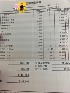 2020/06/30 00:30おかーさんです。残すところ、クラウドファンディングも投薬も明日の6/30までとなりました。前回の活動報告の後、5/30と6/20に通院し、投薬期間中の最後の通院となりました。投薬自体は明日で終了しますが、7/1-9/30まで病気が再発しないか経過観察期間へとはいります。2回の診療明細と体重増加により追加購入した診療明細を掲載いたします。血液検査の結果も良く、0.6以上あれば安心とされるAG値も0.7を上回りました。しかし、今まで、通院時の検査で特にぐりの体調に変化はなく順調かと思われていましたが、6/20の通院時のエコー検査の際にぐりのリンパが腫れているように思える部分と、心臓に少し雑音が入っているとご指摘を受けました。心臓の雑音については猫において時々起こる症状であることと、詳しく心音を聞いていただき「今のところ問題はないだろう」と先生から伺いました。リンパについてはFIPの闘病が終わり寛解した猫ちゃんでもリンパが腫れたままになってしまったり肉芽腫が残る子も中にはいると初めて伺いました。今までの通院では伺っていなかった事が多くなり、投薬期間が長くなってから出た症状のため、薬の副作用なのではないかと思いましたが担当の先生より「新薬の副作用ではない」と明記を受け、ぐり個人の症状と言われました。投薬77日目あたりからぐりの呼吸がとても速くなり、1分間の呼吸数を起きているとき・寝ているときに分けて何回かカウントし平均を計算したところ、1分間で起きているときに69回・寝ているときでも20回前後という通常の猫の呼吸数と比べると倍近い速さとなりました。走ったりするとぐりが呼吸時に「ウッウッ」と唸るような短い声がはいるようになりました。6/19に1度目の嘔吐があり、薬が吸収される前に吐き出されたため全容量の投薬を再度行いました。(ぐりは投薬中最後の通院後に合計2回嘔吐しました)6/23の夜23時頃にも同じような症状が起き30分以上止まりませんでした。鼻をヒクヒクさせる症状がおさまらなかったため、夜間病院を受診しレントゲンと触診・心音の確認をしていただきました。レントゲンの結果によると、ぐりの前胸部に白いモヤがかかっており、リンパの腫れによって呼吸の通り道が圧迫されておりそれによってぐりの呼吸数が上がっている可能性もあるとのことでした。横側から撮ったレントゲンによると白いモヤが目立ちますが、上部から撮ったレントゲンでは白モヤは少なく空気も取り込めているので呼吸困難の症状ではないとのことでした。かかりつけの先生からも新薬の副作用は肝臓数値の悪化と軟便のみといわれており、これらの症状はぐりの個別の症状と言われました。夜間病院の診察以降、極力ぐりのテンションが上がって走り回ったり息が荒くならないよう、家の中で運動会が始まりそうなときには別室に隔離し安静にさせています。生後6ヵ月と7ヵ月の兄弟を思う存分遊ばせてあげれないのは、とても切なく本人たちも「なんで?もっと遊びたいのに!」という感じで文句を言いたげな雰囲気がでています。ぐりが今まで飲んだ薬のシートの一部です。家に来たときのぐりの体重は1.2㎏しかなく、ご飯に興味もなく食が細かったぐりが、84日間という長い期間に小さな体で薬を飲み続けてくれました。ご飯も大好きになり、お兄ちゃんに負けないくらい沢山食べれるようになり、現在のぐりはノルウェージャンフォレストキャットの生後6ヵ月の平均内に体重が追いつき3.8㎏になりました!!最後の血液検査の結果と検便の結果もでました。今回はお兄ちゃんのぐらも検便を提出しました。結果からいいますと、ぐりは血液検査および検便でもFIPに変異する猫コロナウイルスが陰性となり、お兄ちゃんのぐらの検便が陽性となりました。クラウドファンディングの説明文にも記載しましたが、猫コロナウイルス自体は室内・外猫に関わらず猫全体の80%が保有しており、多頭飼いのトイレ等で簡単に移ってしまうウイルスです。本来はウイルス自体は非常に脆弱のため、検便で猫コロナウイルスが陽性であってもFIPに変異する確率はとても低く、先生にも「ぐらちゃんはFIPではないと思う」と言われています。生後7ヵ月のラグドールだと4.6kgと若干小柄ですが食欲旺盛でよく動きよく遊びよく寝て弟の面倒もよく見てくれる優しいお兄ちゃんです^^生後1年までのFIPの発症率が高いこともあり、少なくとも年内まではぐらの免疫が弱らないように気を付けてみていこうと思います。FIPと診断された4/8のぐりは、お腹がパンパンではちきれそうで、お腹をひきずりそうになりながら歩いていました。新薬の投薬が始まるまで、ぐりの目が濁ってきて死に近づいてきているような絶望感や、腹水がしみてぜぇぜぇと苦しそうなぐりをみて、寝て目が覚めたら1人で天国に行ってしまうんじゃないかと、真夜中に泣いて、ぐりの呼吸が止まらないか気になり眠れなかった4月が嘘のようです。投薬が開始されてからは、「絶