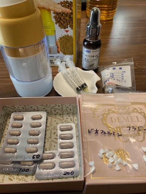 ぐりのお薬箱です。上記には映っていませんが、薬を粉上にすりつぶして水に溶かし、注射器で与える用意もあります。