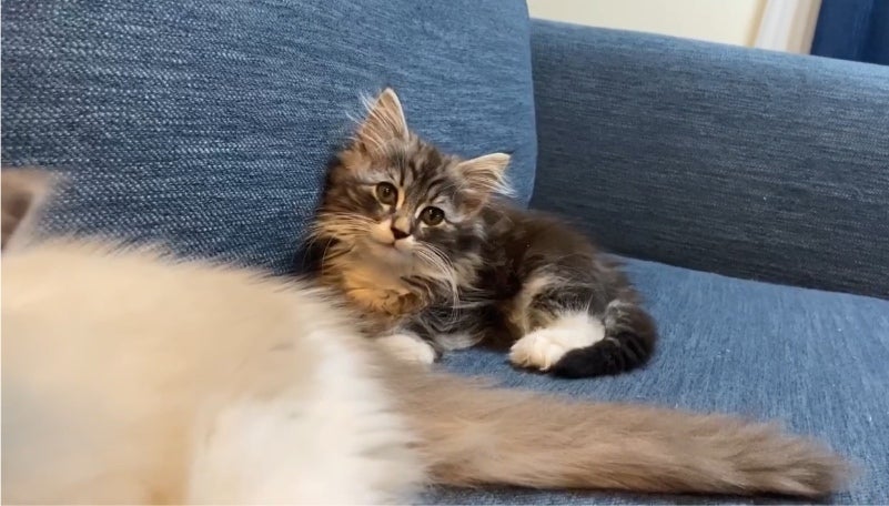 朝カーテンの裾に隠れたり出てきたり少し動く素振りが見える。