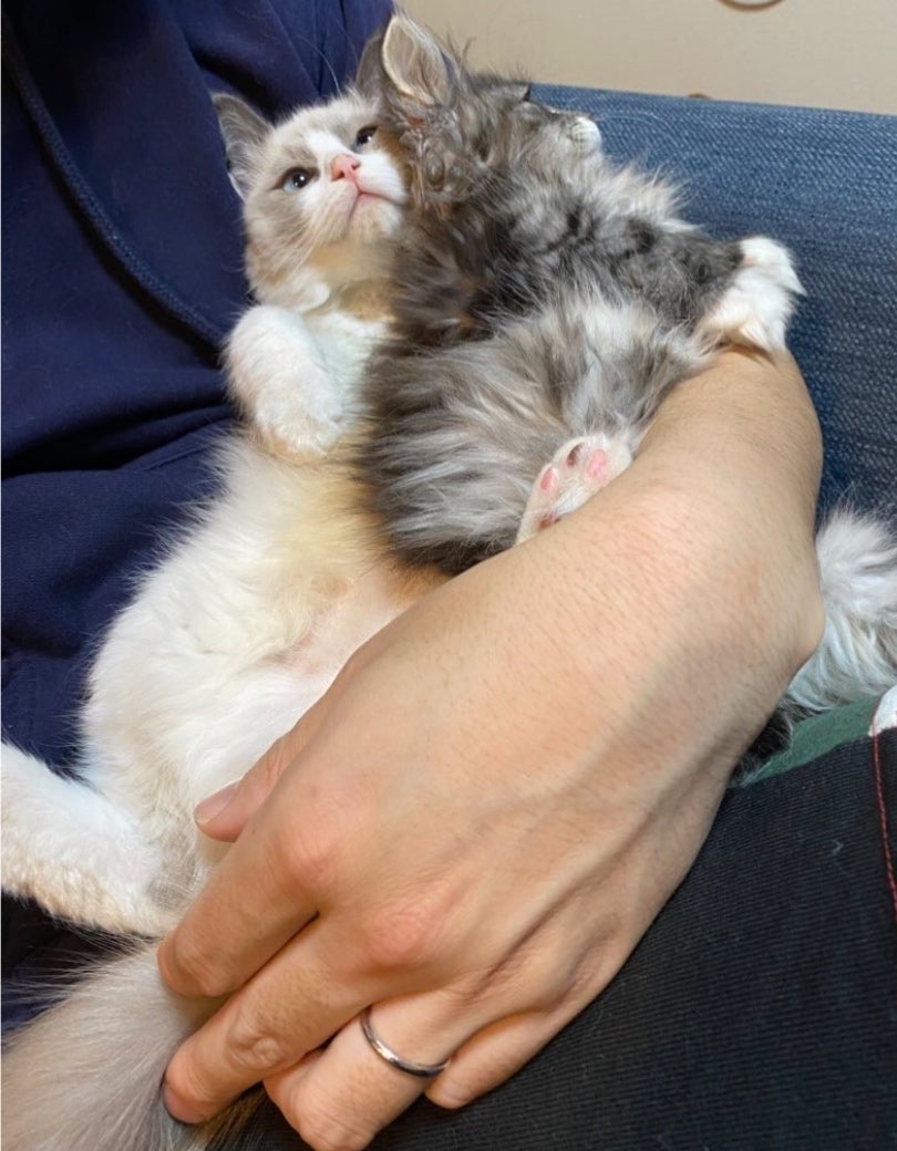 腹水が少ししぼみ本人も嬉しそうに動く。1時間おきにミルク・総合栄養食・大好きなCiao缶やササミ、えなじーちゅーるを食べさせて体重を増やす。(腹水が抜けていくと体重が減るため)