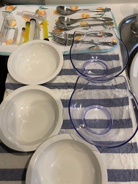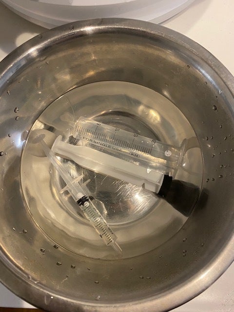 投薬時に飲むお水・栄養剤で使用する注射器は1回使用ごとに100度の熱湯で煮沸消毒し、ご飯をいれる食器などはキッチンハイターを薄めてつけおきし除菌しよく洗った後にしっかり乾かします。