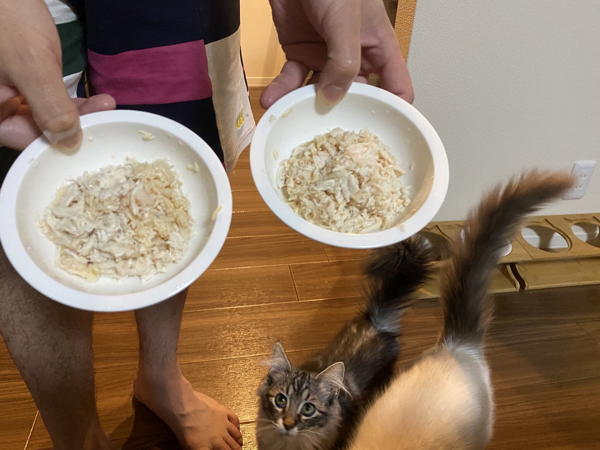 21時30分にMUTIANを投与をするとなると、お昼ご飯を食べた後に夕方から19時30分までにちゅーるを2本与え22時30分以降によるご飯の茹でササミを与えています。