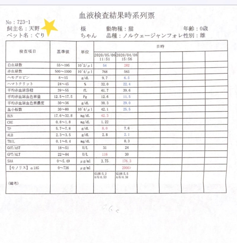 GPT/ALTの炎症は新薬MUTIANの副作用の可能性が高いとのことで、新薬の他に肝臓の炎症を下げるお薬を処方されました。TP(体内のトータルたんぱく質)が高いのはぐりが病院に着く前に脱水症状がでた関係で高くでているとのことでした。