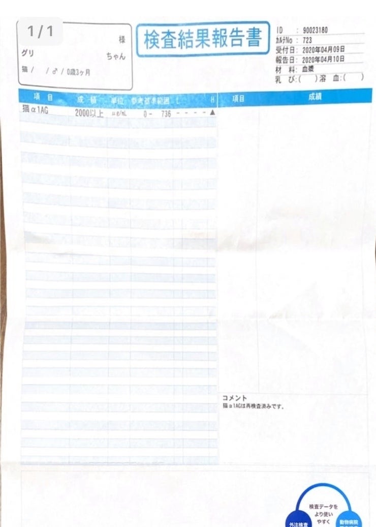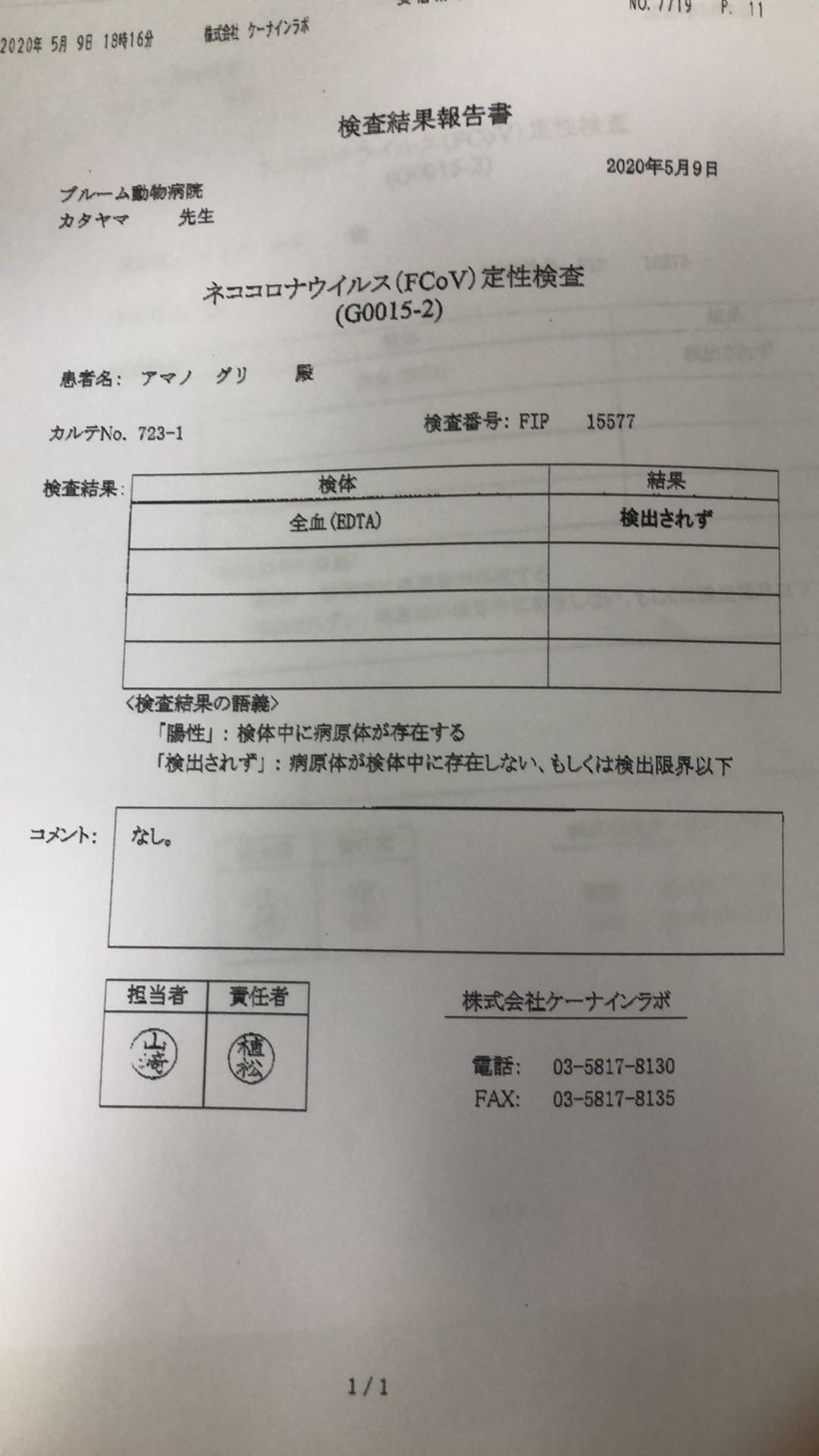 新薬の効果が出て、ぐりの体内のFIPへと変異するコロナウイルスが検知されないぐらい減ったという結果で「陰性」となりました。