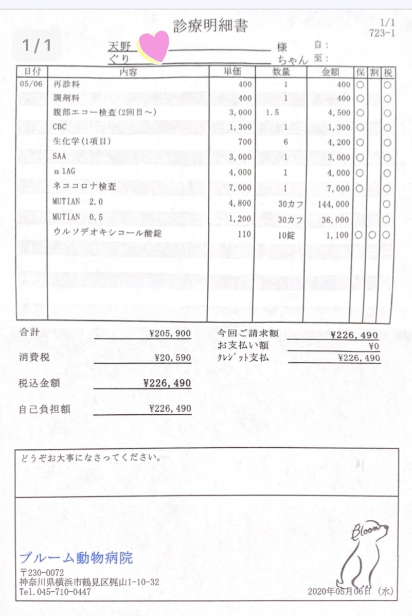 ぐりの症状が改善されるにつれ、ぐりの体重が増加し診察時は2.5㎏になっていたため先生より「2.7㎏になると新薬の投与量が300mgとなるので薬が足りなくなった場合は郵送します」と伺いました。新型コロナウイルスの影響もあり、ぐりの経過が良いことから次の診察は約1カ月後の5/30となりました。この日のお会計は22万6千円でした。