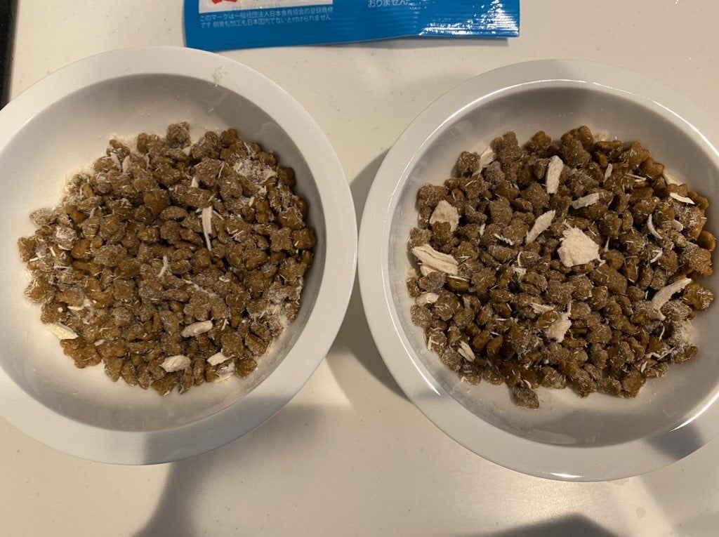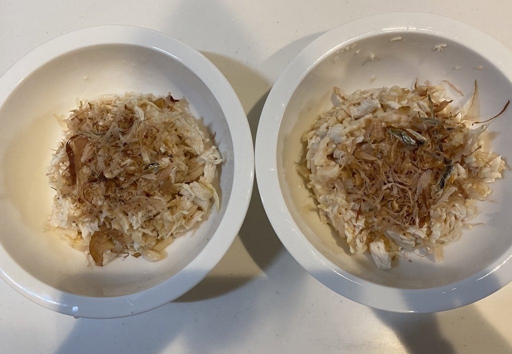 食いつきが良くなるように、かつおぶしやまぐろパフなどのふりかけをかけてあげると沢山食べてくれます。毎食おいしそうに食べてくれるので、嬉しくなってササミの茹でスキルをアップさせてぷりぷりのササミを食べさせています。笑