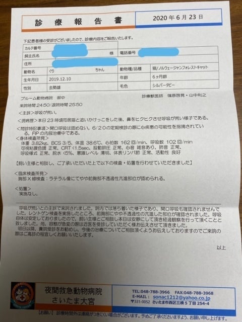 しかし、今まで、通院時の検査で特にぐりの体調に変化はなく順調かと思われていましたが、6/20の通院時のエコー検査の際にぐりのリンパが腫れているように思える部分と、心臓に少し雑音が入っているとご指摘を受けました。心臓の雑音については猫において時々起こる症状であることと、詳しく心音を聞いていただき「今のところ問題はないだろう」と先生から伺いました。リンパについてはFIPの闘病が終わり寛解した猫ちゃんでもリンパが腫れたままになってしまったり肉芽腫が残る子も中にはいると初めて伺いました。