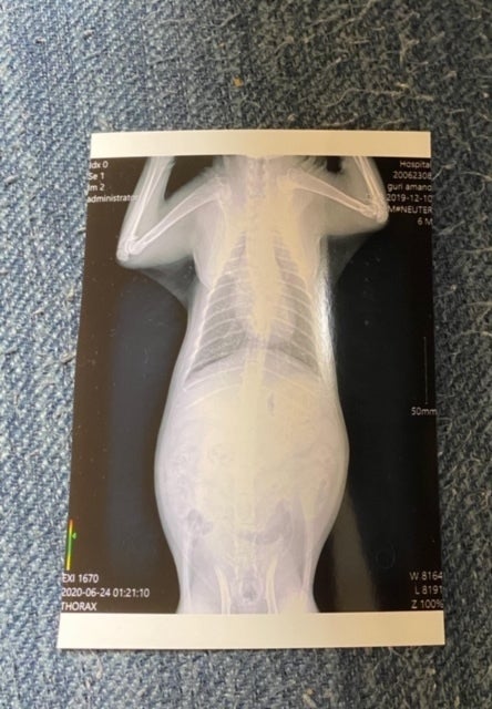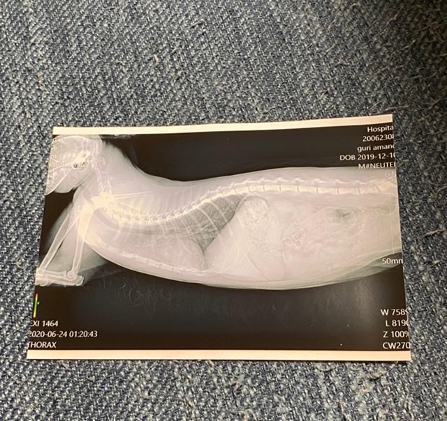 レントゲンの結果によると、ぐりの前胸部に白いモヤがかかっており、リンパの腫れによって呼吸の通り道が圧迫されておりそれによってぐりの呼吸数が上がっている可能性もあるとのことでした。横側から撮ったレントゲンによると白いモヤが目立ちますが、上部から撮ったレントゲンでは白モヤは少なく空気も取り込めているので呼吸困難の症状ではないとのことでした。