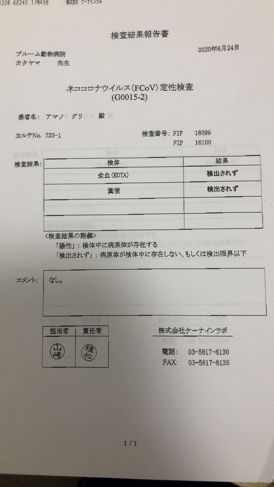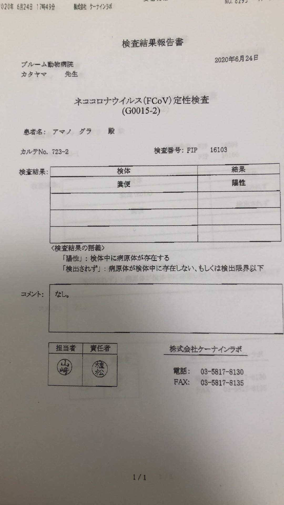 クラウドファンディングの説明文にも記載しましたが、猫コロナウイルス自体は室内・外猫に関わらず猫全体の80%が保有しており、多頭飼いのトイレ等で簡単に移ってしまうウイルスです。本来はウイルス自体は非常に脆弱のため、検便で猫コロナウイルスが陽性であってもFIPに変異する確率はとても低く、先生にも「ぐらちゃんはFIPではないと思う」と言われています。
