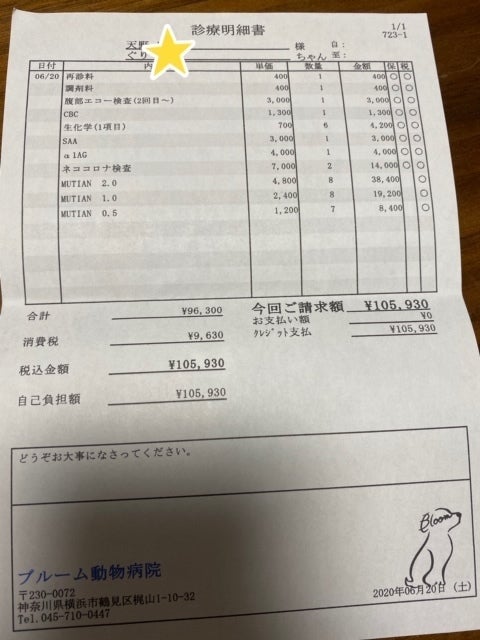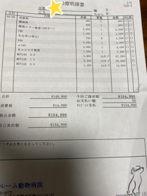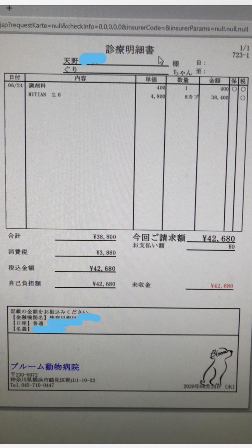2回の診療明細と体重増加により追加購入した診療明細を掲載いたします。