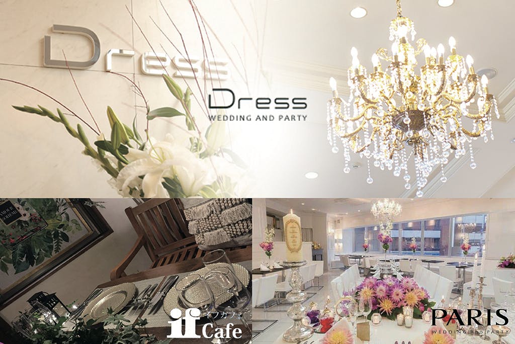Dress・PARIS WEDDING AND PARTY / if cafe (ドレス・パリス ウェディング アンド パーティー / イフ カフェ)の3会場を持つ会社です。結婚式二次会を中心に披露宴・歓送迎会・忘新年会等の貸切パーティーがメインとなる店舗です。