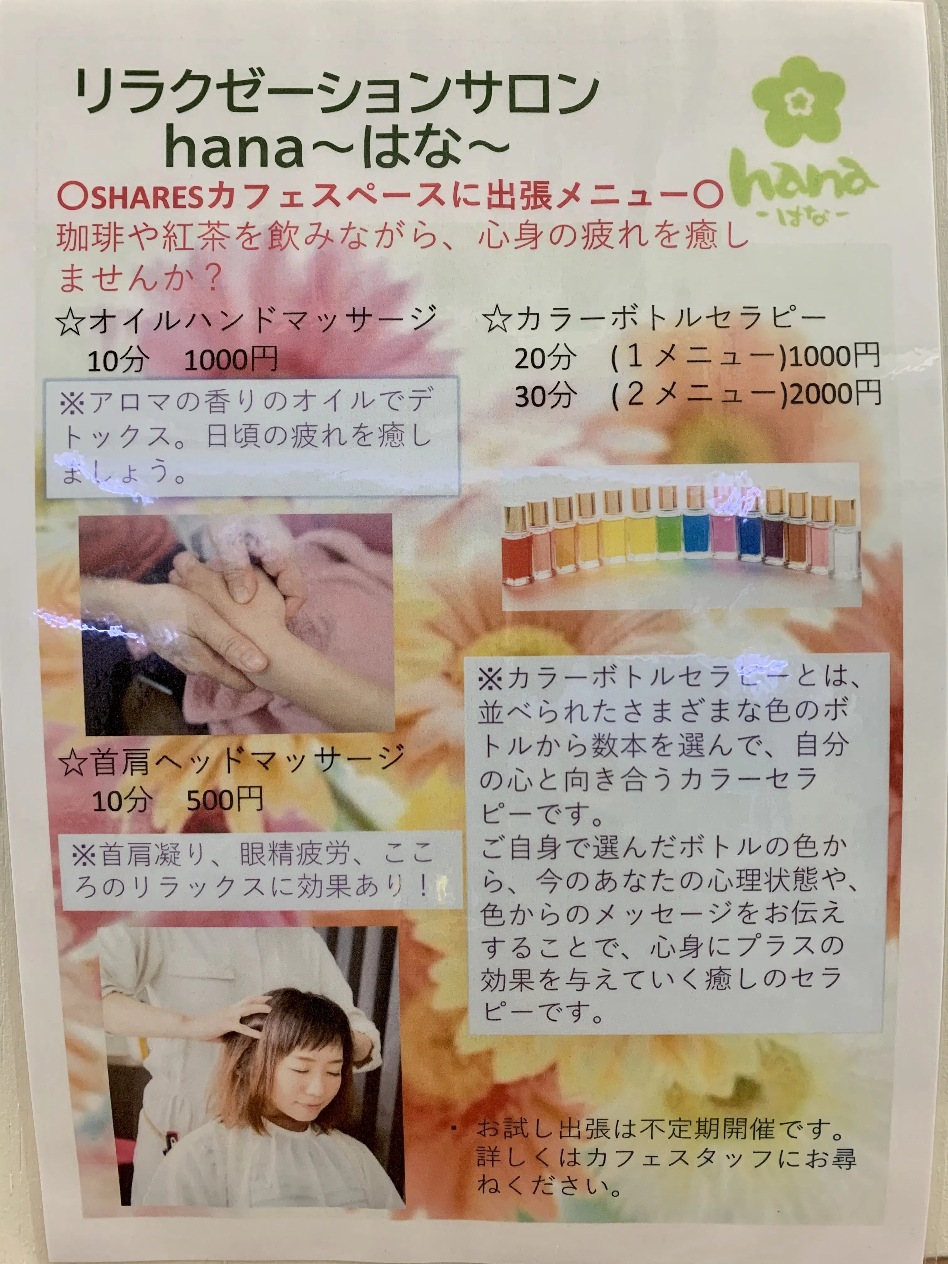 キャンプファイヤーでご支援いただいたみなさまには、それぞれのメンバーが、様々なリターンを用意していますが、リラクゼーションサロンhana〜はな〜からは、各施術やカラーボトルセラピーで使えるクーポン券をお渡しします。半分はご自分へのご褒美に。もう半分は、お友達や大切な人へのプレゼントとしてお使いください。