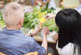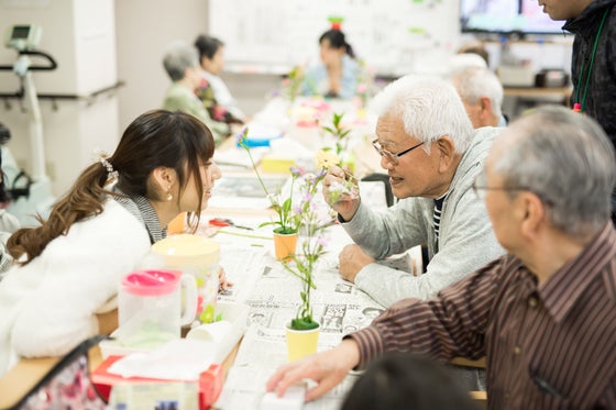 ボランティア活動の内容は、高齢者施設を訪問し、”おはなし”をする事です。メンバーは大学生が中心でいわば素人。カウンセリングでもなく傾聴でもなく、素人の若者とお年寄りが”出会い”、自由に楽しく”おはなし”をする事が”おはなしやさん”の活動です。より楽しい時間にするためのツールとして、フラワーアレンジメントを取り入れています。こちらも、やり方やルールは特になく、とにかく自由にやってみることがおはなしやさんならではです。毎回、個性あふれる作品ができます。見ているだけだった方も、いつの間にかお花に手を伸ばしていたりします。実際の活動では、さっきまで一人で歩く事すらままならなかったお年寄りがみるみるうちに輝きだし、楽しそうに昔話に花を咲かせる姿がとても印象的です。 「人は人とつながっていたい、関わっていたい」という本質がそこにはあるように感じます。そして、いかにそれが普段の生活の中で満たされていないかも然り。