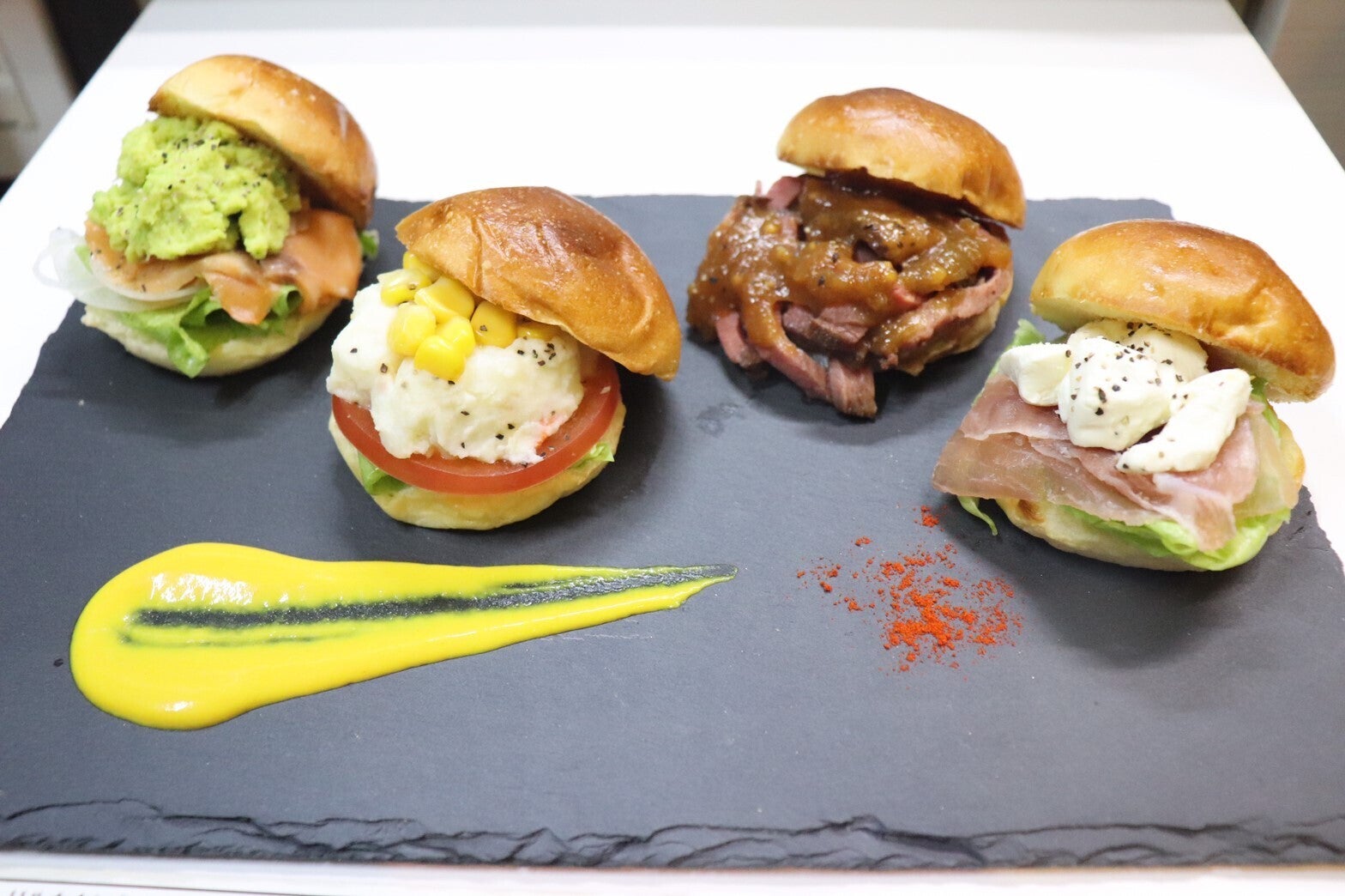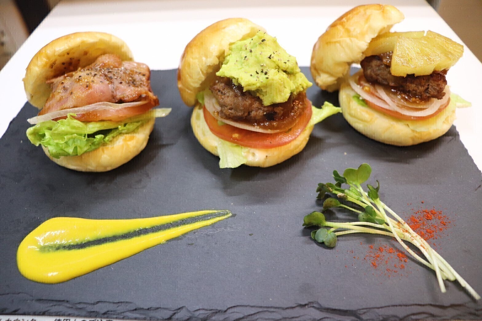 →with hamburgerというコンセプトに従い、全てスライダーサイズでご提供させて頂いております。また、アラカルト系のバーガーやデザートバーガーなどハンバーガーのみでもコースを楽しめるようになっております。