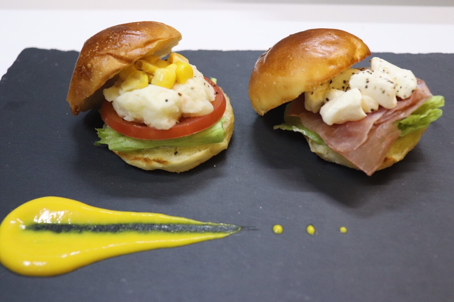 →地元ベーカリーより特注の直径約6cmのバンズを使用。表面サクサク、中ふんわりと仕上げている為食感をお楽しみ頂けます。