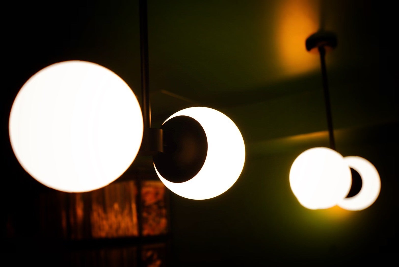 カウンターの上や壁上部にある照明はデザインしてオーダーし、硝子の球体部分は職人さんに吹いていただいた世界に1つの品です。