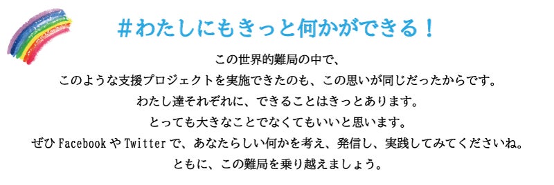 このプロジェクトを周囲にお話したところ、多くの方から「専門的な技術で支援できることは素晴らしい」というお声をいただきます。そしてまた、資格保持者の方々を含め、賛同、また協力いただける方がどんどん集まっています。しかし、専門的な知識や技術はなくても、たとえ一つ一つは大きなことでなくても、今それぞれ「私たちにできること」は沢山あるように思っています。