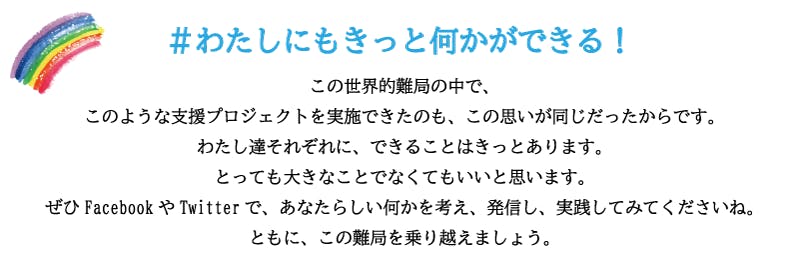 この難局において、我々のプロジェクトに対してでなくても、あなたが共感したプロジェクトがあればぜひ支援してください。そうして行き着く先のビジョンは、きっと同じであると感じています。