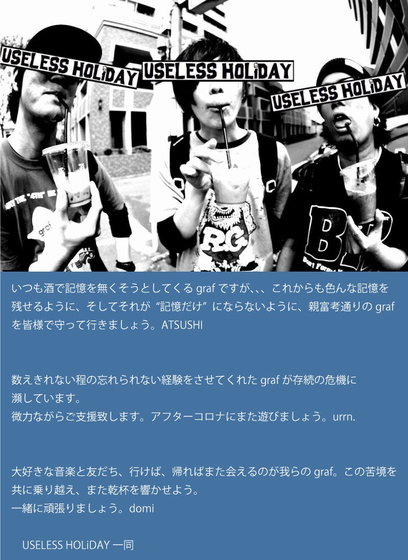 コロナが収束したら、またgrafで全国のライブハウスで素晴らしい音楽が鳴り響く日々を強く願っております。そのために準備を進めてまいりますので何卒、応援を宜しくお願い致します。