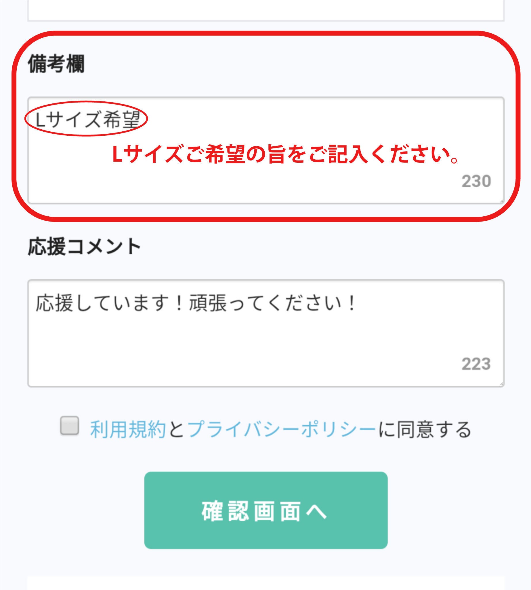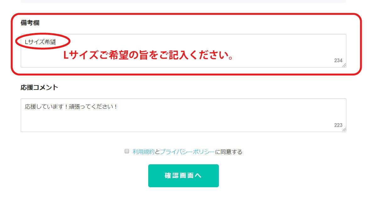 備考欄を確認させていただいた上で、Lサイズをご用意させていただきます。