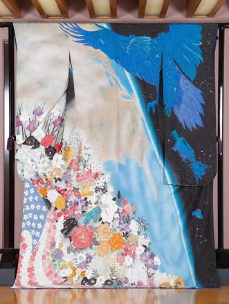 悩んだ末にたどり着いたのが「大統領」と「50州から成る合衆国」という主題でした。 そこで、成瀬先生は、大統領の紋章に描かれている白頭鷲を、大きく地球を俯瞰するように構成し、 宇宙からアメリカ大陸を見る様子に「大統領が国を守っている」という意味を込めました。 また、50州の州花を全て描くことで、それぞれの州が独立自尊しながら一つの国を成している「合衆国」を表現しました。 その結果、全ての州のアメリカ人にとって、このKIMONOとの絆が生まれることとなりました。