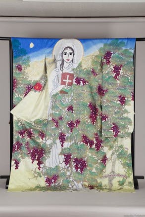そんな、お互いを認め合う二人だからこそ、中来田氏を中心としたKIMONOにも、 山下氏の細かい型紙が聖人ニノのフードの中を飾り、 山下氏を中心とした帯の中にも、中来田氏の葡萄の文様を取り入れ、 まさに工房としてのトータルな作品に仕上がっています。