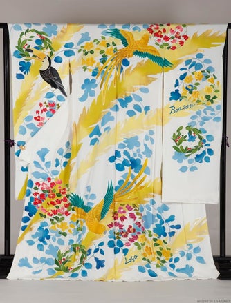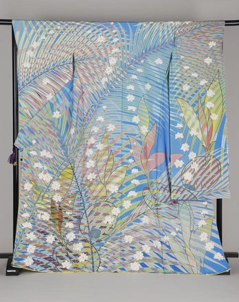 ■美しい南コーカサス地方 西アジアの北端、南コーカサス地方に位置するジョージア(旧グルジア)は、 北側にロシア、南側にトルコ、アルメニア、アゼルバイジャンと隣接しています。 古来より多くの民族が行きかう交通の要衝として、 多民族による支配にもさらされてきたましたが、 キリスト教の信仰を含む伝統文化を大切に守り通してきました。 「風の谷のナウシカ」の衣装デザインの元ともいわれる民族衣装も有名で、 古代語の一つとされる「グルジア語」では「サカルトヴェロ」が国名です。 ■天空の教会とワイン発祥の地 ジョージアには有数の世界遺産があり、 天空の教会などその風景の美しさと、ジョージアの人々の優しい人柄は多くの観光客を惹きつけている。 またワイン発祥の地としての歴史は古く、楊貴妃やクレオパトラやナポレオン、 英国首相チャーチルがこよなく愛したとされている。 そんなワインは、ジョージアの人々にとっては欠かせないものであり、 同時にワインに必要なブドウの生産はこの国を代表するものです。 ■葡萄そして聖人ニノそしてピロスマニ 作者の中来田氏と山下氏は、それぞれに独自の型絵ローケチ染作家として活動をしていますが、 絵画的な表現が得意な中来田氏と小紋調のデザインが得意な山下氏が力を合わせて、 今回は工房真朱としてKIMONOと帯の両方を製作することになりました。 ジョージアのモチーフは、この国の産業に欠かせないワインの「葡萄」、 そしてキリスト教をジョージアに伝えたとされる「聖人ニノ」、 さらにピカソに「彼にはかなわない」と言わしめた 天才画家「ピロスマニ」の有名な恋物語から連想し、 「百万本の薔薇」という歌から「薔薇の花」を取り入れました。 さらに、美しいコーカサス山脈と空に浮かぶ月を描くことに行きつきました。 帯には、ワインの甕のデザインを取り入れて、 その特徴的な形を巧みに小紋文様を構成しました。 ■丸いものは四角に彫る ローケチ型絵染は、彫刻刀を用いて型紙を彫るところが特徴ですが、 ロウを用いた防染の行うところから「丸いものは四角に彫れ」という格言が存在します。 このことは、一見不思議に感じますが、実際に型紙を用い、ロウ伏せを行って染色すると、 ロウと染料のせめぎあいによって角張った輪郭のほうがより丸く染めあがるといいます、 型絵ローケチ染ならではの経験値から生まれた技術です。 今回の作品には大きく分けて三つの型紙が用意され、 一つは背景に用いたコーカサス山脈と聖人ニノ、そして一つが葡萄、 最後が薔薇です。 これらを絵画を描くようなタッチで彫刻調で掘り出す中来田氏の才能は特筆すべきもので、その結果筆致では得られない柔らかいラインが生まれています。 また、小紋調を得意とする山下氏が掘り出したワインの甕の文様は、 愛らしくキャッチーな存在として帯にアクセントをつけています。 ■二人で、一人 中来田氏と山下氏はとても明るい性格の持ち主で、常に二人そろって工房で仕事をしています。 一言でいうならお喋りな二人は、お互いの才能を讃えつつ、 またお互いの作品を批評しあう双子の様な存在です。 そんな、お互いを認め合う二人だからこそ、中来田氏を中心としたKIMONOにも、 山下氏の細かい型紙が聖人ニノのフードの中を飾り、 山下氏を中心とした帯の中にも、中来田氏の葡萄の文様を取り入れ、 まさに工房としてのトータルな作品に仕上がっています。 型絵ローケチ染ならではの染め上がりの美しさに、 またその独創的な構図にKIMONOの新しい表現を感じるとれる作品です。