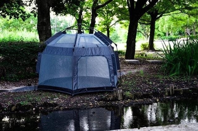 片手でテントの上部を持ち上げるだけで組み立てが完成。
