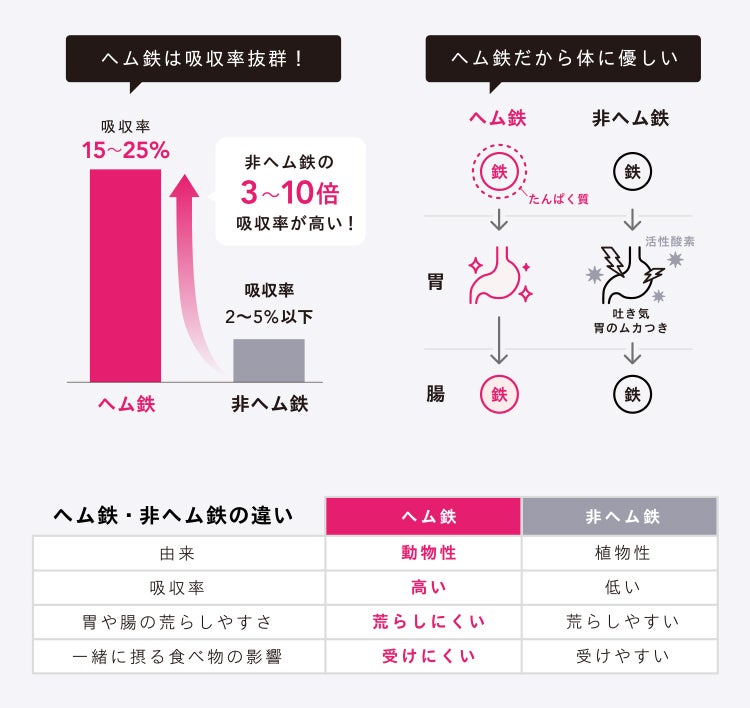 「ヘム鉄」は、鉄がタンパク質に囲まれているため胃や腸を荒らしにくく、吸収がスムーズ。非ヘム鉄に比べて 3〜10 倍も吸収率が高いのが特徴です。他の食べ物と摂っても、吸収率が低下することはありません。