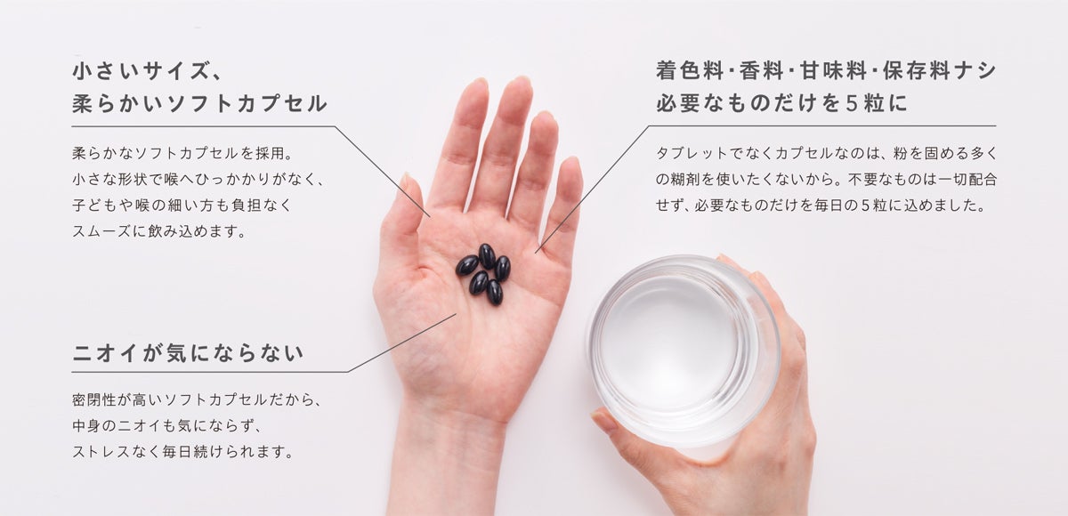 サプリメントとして不要なものは一切含めず、吸収率と品質の高さにこだわった栄養素を1日5粒にしっかり配合。栄養の力で、女性のキレイと健康を応援します。