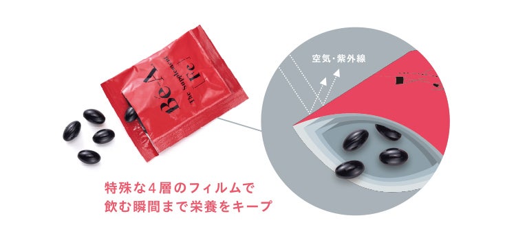しっかり栄養を届けるため、Bé-A〈ベア〉独自の工夫は特殊な4層のフィルム。保存料を使わず製造より2年間、栄養素を損ないません。