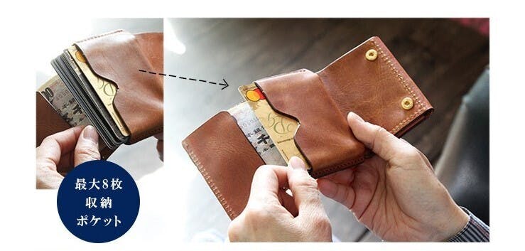 小さい財布ではよりコンパクトにするために、お札を折り曲げて収納する構造のものありますが、弊社のお財布ではお札を折り曲げずにそのまま収納することができる構造となっております。