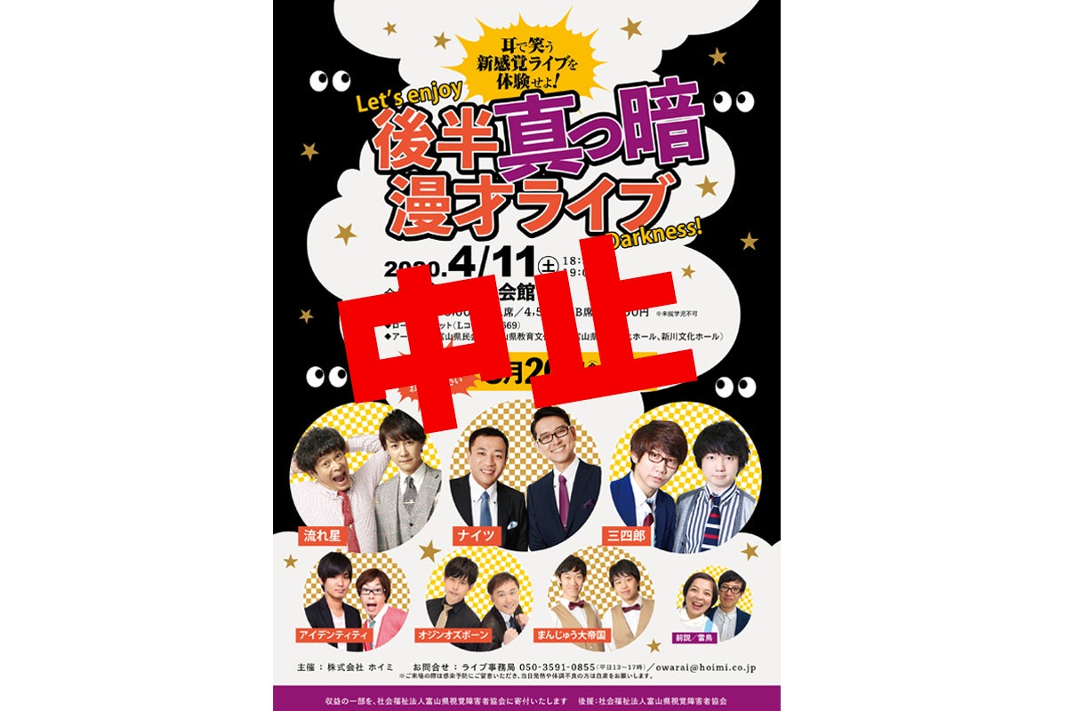 ①は長野と石川という初めての地での公演、②は暗闇の中での漫才という日本初の企画ライブ、という大きな挑戦でした。 しかし残念ながら…新型コロナウイルスの影響で中止にせざるを得ませんでした。