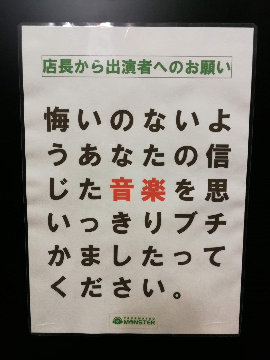 バンドマンの多くは社会から見ればクズ。だから音楽を全力でブチかます事だけに集中できれば幸せなのです。高松にはMONSTERがあるから、私は安心してツアーの相談ができます。そして私の音楽に救われてるヤツが多かれ少なかれ居るはずで、私の音楽を大切にしてくれるMONSTERとこれからも馬鹿笑いしながら音楽を軸に生きて行きたいと。デカい仕事とか正直全く興味がない。高松に帰る場所があることだけが私には救いです。いつもありがとうございます。