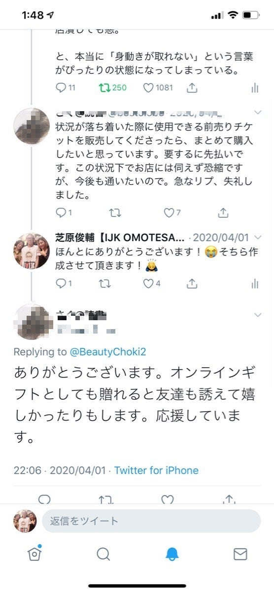 2020/05/27 15:20はじめに代表の芝原です。皆様、本当に沢山のご支援を頂きまして誠に有難うございます。弊社のクラウドファンディング期間も残り5日となりました。現在約1200万円もの支援金が集まっており驚きと感動で胸が一杯です。心より御礼申し上げます。有難う御座います!!!!リターンのお届けについてクラウドファンディング終了後にご登録頂いているメールアドレスに順次リターンのご案内をさせて頂きますので今しばらくお待ちください。シャンプートリートメントなどのリターンは6/1より順番に発送させて頂きます。お店での受け取りをご希望の方は是非ご連絡頂けますと幸いです。到着まで今しばらくお待ち下さい。新しく追加したリターンについて残り5日ですが新しくリターンを追加致しました。3900円...祝!大感謝!!クラウドファンディング目標達成記念イベント参加券!!!(コロナ明けのどこかの日曜日夜17:00〜23:00開催予定。イベント時間内は入退場自由に可能)IJKとLm.スタッフも全員参加!BAR Lm.で飲んで食べての立食パーティー!是非感謝のお気持ちを直接お伝えさせて下さい!原価度外視食べ飲み放題のイベント参加券!感謝の気持ち「thank you」にかけて3900円。40名限定となります! ※コロナウイルスが収束後のどこかの日曜日でイベントを行わせて頂きます。※イベント日にどうしても日程が合わず参加できない方で返金希望の方は3900円を返金致します。※万が一第二波などでイベント開催ができなくなった場合も全額返金致します※未成年不可10000円...【芝原代表or恵梨香店長orカワイミオ副店長とZOOMで1時間飲める券(1時間)】経営相談、美容師の相談。「ただただZOOM飲みしたい!」なんでもOKです。備考欄に芝原or恵梨香orカワイミオの誰とZOOMのみ希望かを記載して下さい。※日程はプロジェクト終了後にメールですり合わせさせてください。※有効期限無し。※未成年の方はノンアルコールでの対応となります。閉じる30000円...芝原代表とBAR Lm.で飲める券(2h)経営相談、美容師の相談。「ただただ飲んでみたい!」なんでもOKです。※その日の飲み代はかかりません。※日程はプロジェクト終了後に芝原とすり合わせさせてください。※有効期限無し。コロナ収束後でも勿論可能です!※未成年の方はノンアルコールでの対応となります。他にもBAR Lm.のドリンクチケットなど途中で追加したリターンも数多くございます。是非今一度ご覧になってみてください。最後に改めましてご支援頂きました皆様本当に本当にありがとうございます。こんなにも皆様に応援して頂いてるお店なんだと実感し、毎日感無量の想いです。しっかりとリターンをお届けし、皆様に喜んで頂けますよう尽力して参ります。そして、頂いたご支援と応援を胸にコロナウイルスに負けず、より一層良いお店作りをして参ります。残り5日となりましたが、引き続き何卒宜しくお願い致します。 もっと見る支援金額が900万円を突破しました!本当にありがとうございます。