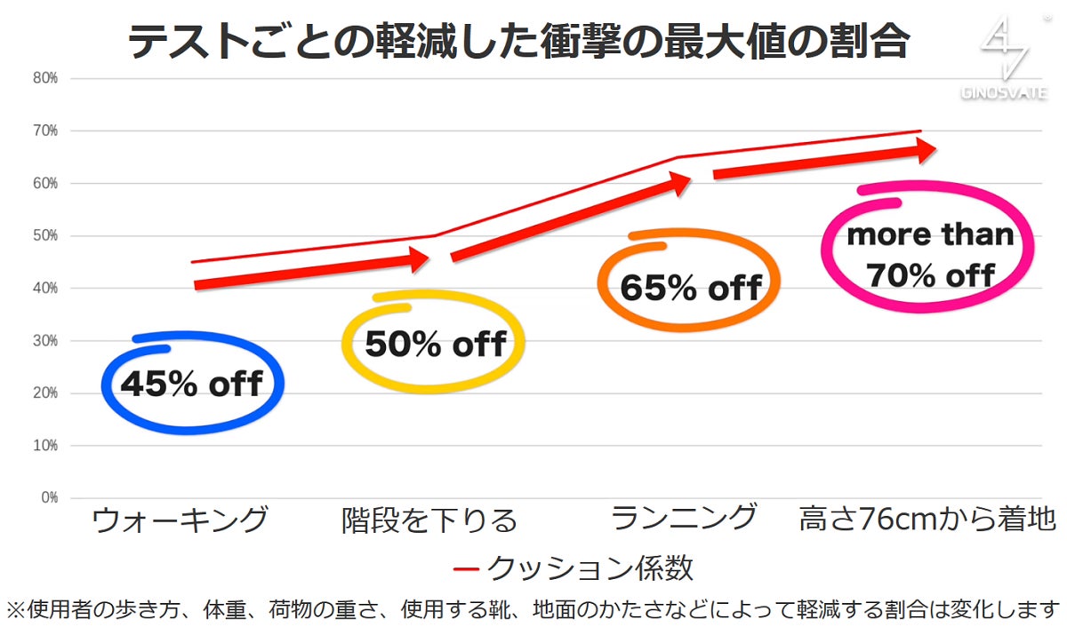 MAGIC 1は、ウォーキングのテストで、衝撃の大きさは45%軽減。単純に45%軽減の計算をすると上記の