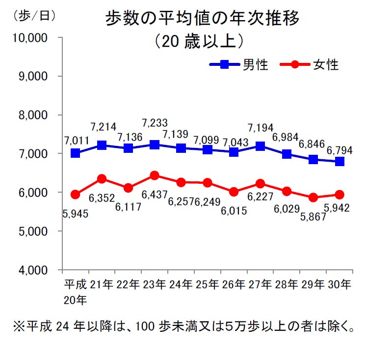 平成30年の20歳以上の歩数の平均値は男性で6,794歩、女性で5,942歩でした。