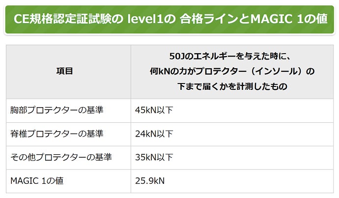 また、衝撃吸収力を数値化するためにテストしたところ、バイクのプロテクター基準をおおむね満たすことがわかりました。