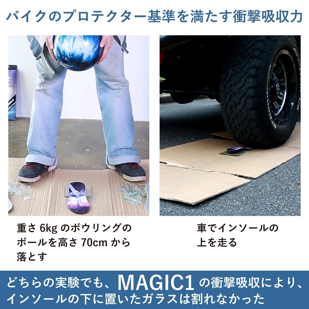 比較テストに合格した素材で製品化したMAGIC 1は、卵が割れない衝撃吸収力で足への負荷が約45~70%軽減、衝撃が強いほどクッション性が上がる、知能衝撃吸収インソールです。
