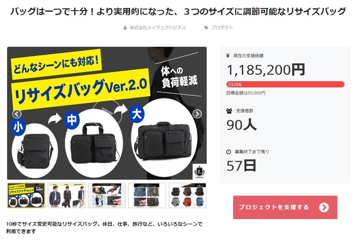 目標金額2000%達成。1つのバッグが大中小の3つのサイズに調整可能なリサイズバッグ。