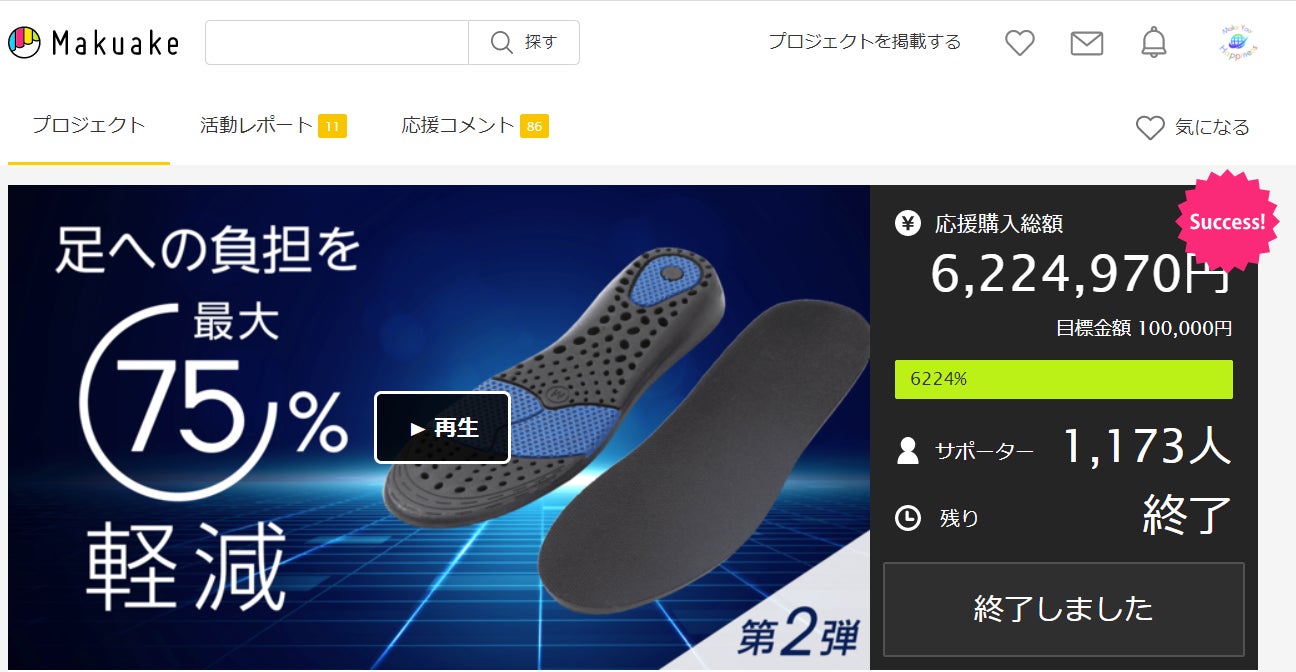 去年、実施された「いつもの靴に"入れるだけ"で足の負担を最大70%軽減 インソール MAGIC 1(マジックワン)」では、 たくさんのご支援をいただき、誠にありがとうございます。