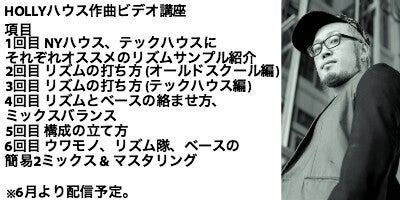 Dimensionマネージャー兼クリエイターほーりーによる、ハウス作曲ビデオ講座の6回分、受講リターン。