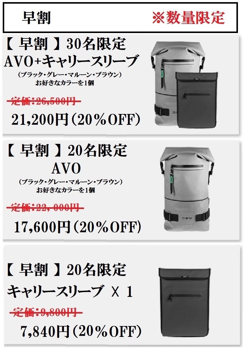 2021/04/21 12:17支援者の皆様DEW製品をご愛用頂きありがとうございます。DEWから新商品が開発され本日Makuakeにてプロジェクトがスタートしましたのでお知らせいたします。【メッセンジャーパニアバッグ MOKK モック】https://www.makuake.com/project/mokk/「AVO」同様にスタイリッシュなデザインや豊富な収納機能、水に強い素材をメッセンジャーパニアバッグに実現しました。先着100名様限定で40%OFFとなります!ご興味がありましたら是非ご検討いただけると幸いです!https://www.makuake.com/project/mokk/ もっと見る