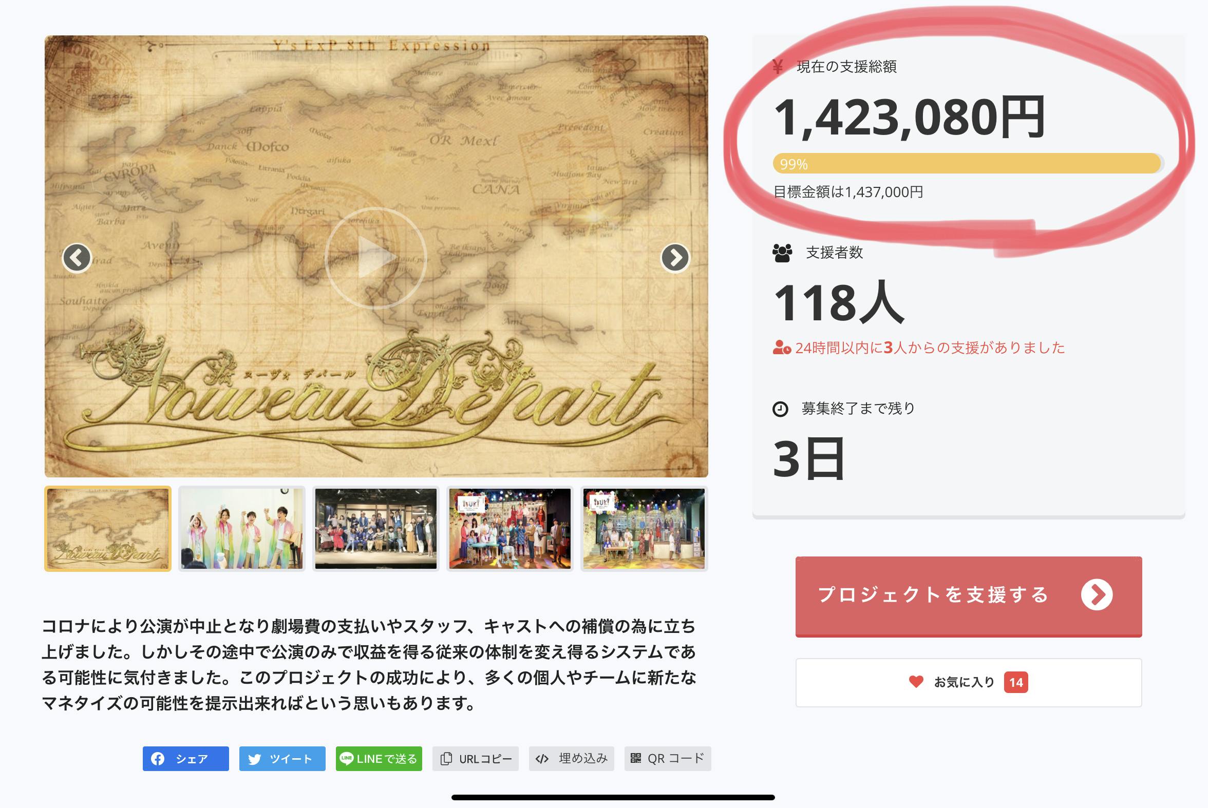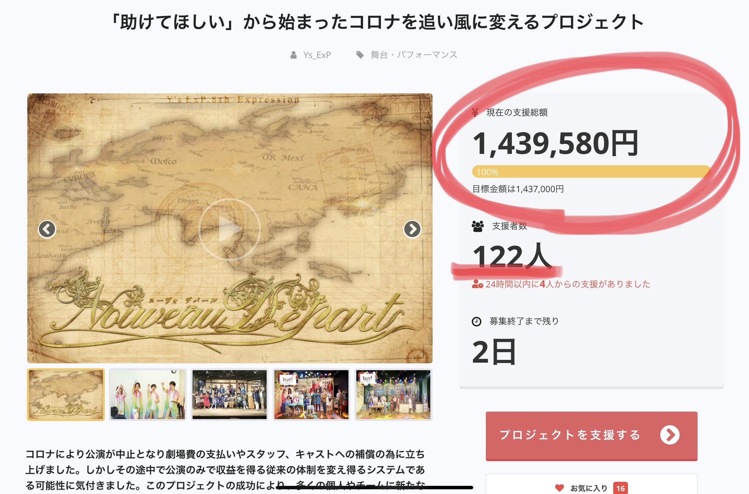 2020/06/24 08:33目標達成まであと約¥14,000 というところまで来ることができました。ご支援、ご声援いただいた皆様本当にありがとうございます!2ヶ月前、クラウドファンディングをする前は、とても大きな壁が立ちはだかっていました。延期によって大きな負債を抱えてしまうこと。スタッフ、役者の皆様の仕事をなくしてしまうこと。楽しみにしてくださっていたお客様を悲しませてしまうこと。でも今は、たくさんの方々のおかげで大きな壁を上り切る手前まで来ています。皆様も大変な状況の中、これだけの方にご支援していただけたことは大きな大きな励みになりました。「こんなにも私たちの作品を待ってくれている人がいるんだ」と。私達にとっても、お客様にとっても長い道のりでしたがあと3日。皆様大変なことは重々承知の上で、最後の一押しをしていただける方がいらっしゃいましたらどうかよろしくお願いいたします。これまでは劇場費、スタッフの皆様、役者の皆様へと還元してまいりましたが、100%を超えて支援していただいた場合にはY's ExP.の活動費(制作資金、HP維持費、劇場予約金)とさせていただきたいと思います。来年の「Nouveau Départ」は皆様の想いの上で成り立つ公演となりました。とても楽しみな公演です。ぜひ、劇場で直接お会いできればと思います。リターンの種類が多く悩まれるかと思うので、おすすめを紹介させていただきます。◆リターンなし がんばれ!の気持ち〔¥500〜〕リターンは必要なく最後にもう一押しの応援をしていただける方。◆観劇チケットをプレゼントできる権〔¥4,000 〕エンタメの専門学生に「Nouveau Départ」をプレゼントできます。演劇を学んでいる学生にY's ExP.の作品を届けたいと思っていただける方。◆クラウドファンディングの打ち上げに直接参加できる権〔¥8,000 〕ぜひY's ExP.メンバーと一緒に打ち上がりましょう!※残り3枠のみ もっと見る第二の目標到達!!