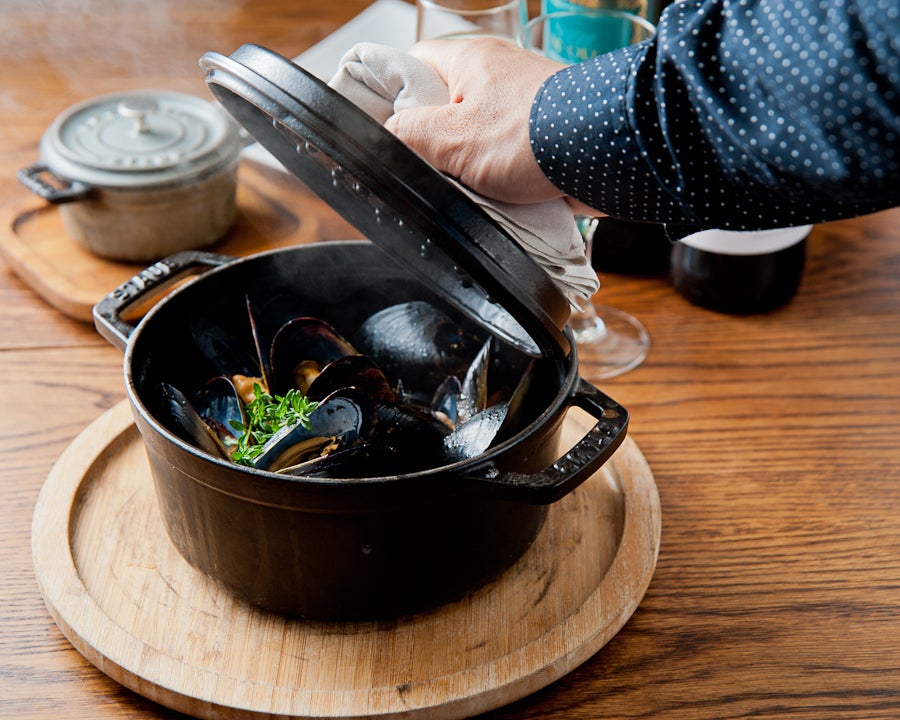 ベルギーの代表的な郷土料理「ムール貝の白ワイン蒸し」をフランス製のストウブでご提供します。