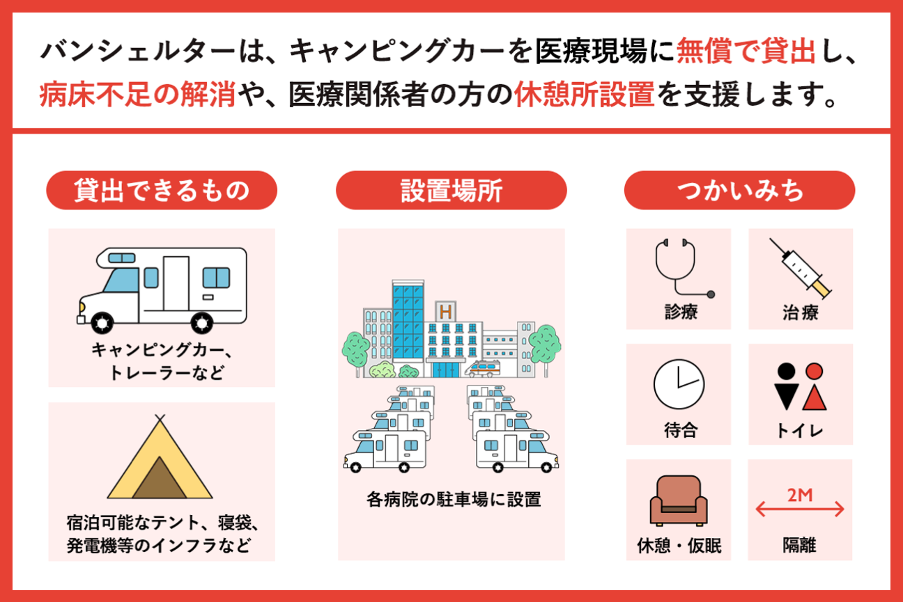 ※ キャンピングカーの貸出をご希望される、医療機関・自治体さま、キャンピングカーをご提供頂けるオーナーさまは van.shelter@carstay.jp までご連絡頂けましたら幸いです。