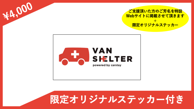 ● ご支援頂いた法人さま(または個人さま)のロゴデザイン(小)・ご芳名を特設Webサイト(Carstay.jp/jp/vanshelter ※月間約30万PV)および活動報告書に掲載させて頂きます。支援時、必ず備考欄にご希望のお名前をご記入下さい。希望されない方は、備考欄にその旨をご記入下さい。