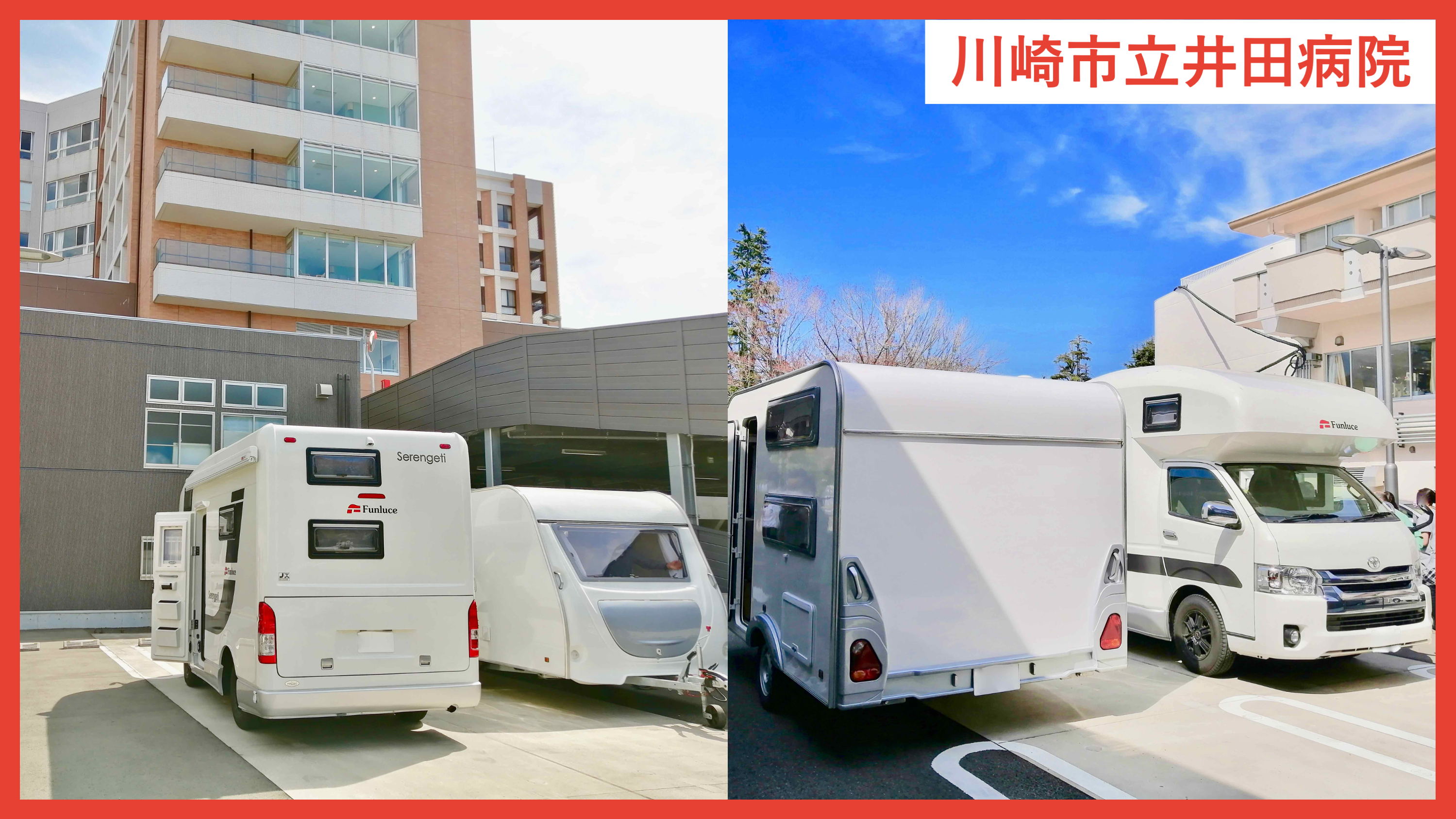 そこで、私たちは、まず、第2種感染症指定医療機関である、川崎市立井田病院へのキャンピングカー・キャンピングトレーラーの無償提供を4月10日より開始しました。