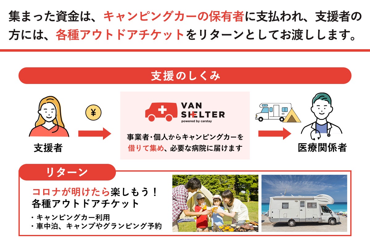 ※ キャンピングカーの貸出をご希望される、医療機関・自治体さま、キャンピングカーをご提供頂けるオーナーさまは van.shelter@carstay.jp までご連絡頂けましたら幸いです。
