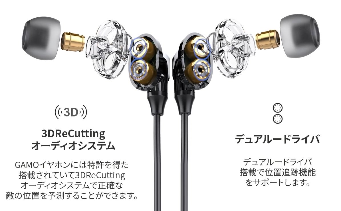 高強度FPS、TPS及び手早く展開するレーシングゲームの世界で敵を追い返すためには、競争優位が必要となります。3DReCuttingオーディオシステムを備えていた世界初、ゲーミング用イヤホンGAMOをご紹介させていただきます。GAMOとともにすると、ゲームの中、まさにリアルサウンドを体験できます。